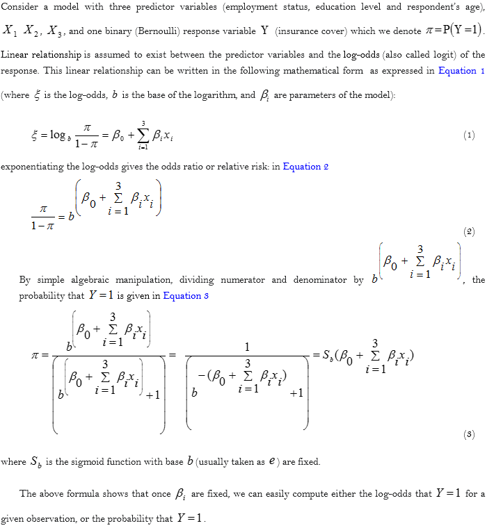Thus, the researchers want to solve the classification problem (insured or not insured) using binary logistic regression modeling based on some selected predictor variables in Nigeria by estimating the following: The relative risk in employment status for insurance cover in Nigeria with reference to employed individuals (as control level), the relative risk in education level for insurance cover in Nigeria with reference to no education individuals (as control level), the relative risk in individual age for insurance cover in Nigeria. Section 2 comprises the materials and method, whereas section 3 is the analysis, results output and interpretation. Sections 4 is the summary, conclusion and recommendation.