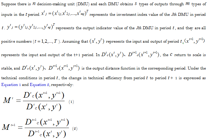 We calculate the geometric mean of the two Malmquist indices in Equation 1 and Equation 2 to obtain Equation 3: