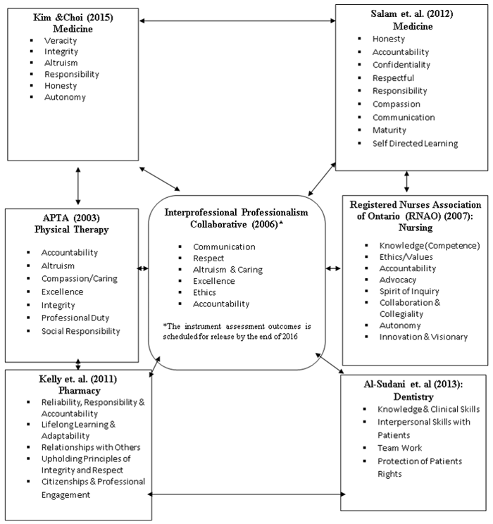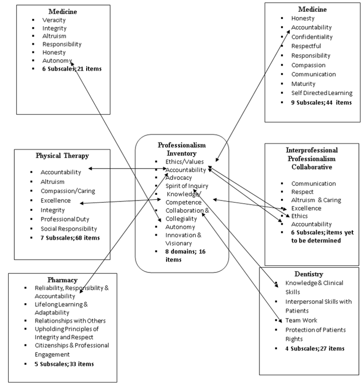 Although not one of the stated objective of this study, following data analysis, we sought to identify the attributes of professionalism that are common between the Professionalism Inventory and the existing professionalism instruments used in the various health disciplines. We drew lines to connect the attributes of professionalism that are common to the Professionalism Inventory and the other professionalism assessment instruments. The a priori evaluation is represented in Figure 2.