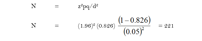 d = allowable error (it is the difference between the true population rate and the sample rate one wishes to tolerate), which is 5 percent within 95% confident limit.