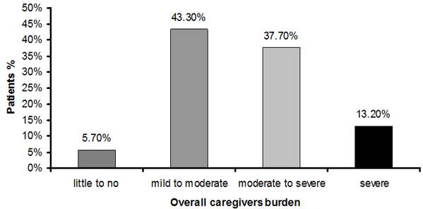 The mean ZBI score was 41.8 (±13.8). Although female caregivers had higher scores (44.06±13.8) than their counterparts (37.12±13.13), no statistical significance was found. Most caregivers reported mild to moderate burden (43.4%) or moderate to severe (37.7%) (Figure 3). High correlations were found between ZBI and GHQ28 total (r=0.71, p=0.001) and ZBI and GHQ28 four subscales (somatic: r=0.62, p=0.001, anxiety-insomnia: r=0.66, p=0.001, social dysfunction: r=0.54, p=0.002, severe depression: r=0.44, p=0.003). ZBI was also correlated with years of care (r=0.38, p=0.004) and hours of care/day (r=0.40, p=0.003).