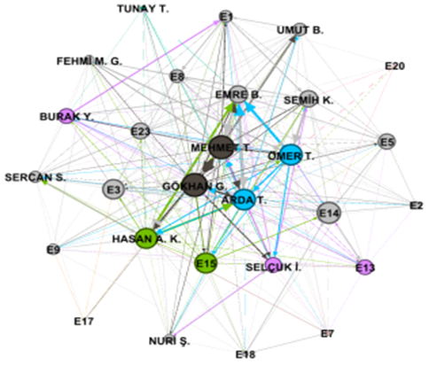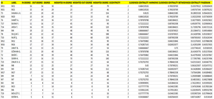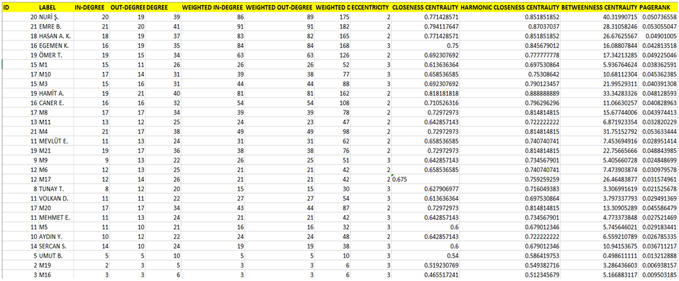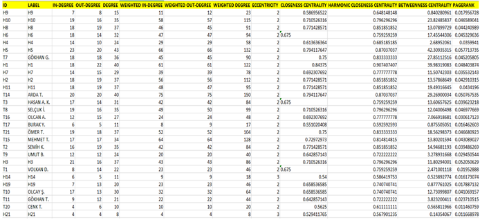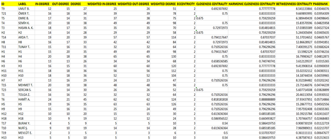 In the preparation of the data, firstly the Excel pass files obtained from the images of each game were processed in the open-source Gephi program and the networks of the matches and the measurements of these networks were obtained. We like to share the network drawing from the Turkey-Estonia World Cup 2014 qualifying match, played on 09/11/2012 and resulting 3-0 Turkey's victory, see Figure 4 and the resulting network measurements see Figure 5.
