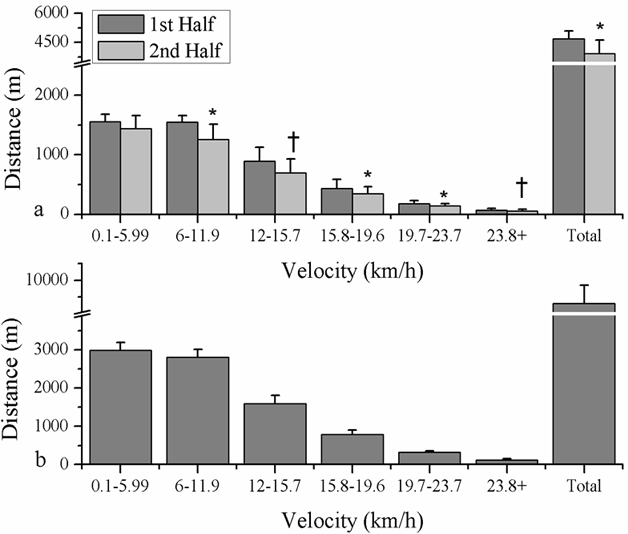 Figure-1a. Distance covered at different speed velocities by players during the first and second half. * Denotes significant (p < 0.01) difference with 1st half distance. † Denotes significant (p < 0.001) difference with 1st half distance. b. Total distance covered at different speed velocities by players during the match.