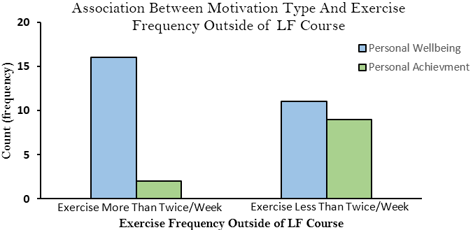 This study was conducted to identify what factors were associated with students’ self-reported perception of LF classes and what drives students to exercise. Although there was a high frequency of personal wellbeing motivation, it did not explain why students enrolled in an LF class, besides for it being required. However, it did demonstrate why students may engage in more or less exercise. Within that, males and females have unique trends in their desires to participate in an LF class. Therefore, future LF classes should consider adopting a curriculum that is able to uphold personal wellbeing motivation while promoting long term exercise participation. Additionally, the curriculum should account for unique needs and goals, personal achievement motivation, that males and females may have in order to promote LF class engagement.