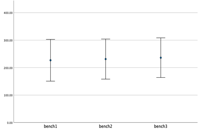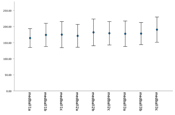 Using a repeated measures analysis, upper body power prior to engaging in nutritional supplementation with an enzyme hydrolysed multiple ingredient product was compared to lower body power after 10 and 21 days of supplementation. Comparing mean scores from trial medball1a to medball3c a significant difference was observed (-26.125, p=0.015). A significant difference in upper body power was also observed between trials medball1c and medball3c (-15.50, p=0.026). Figure 3 shows the mean score values of each trial assessing upper body power.