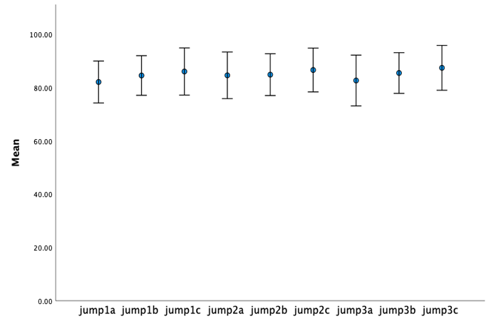 Using a repeated measures analysis, lower body strength prior to engaging in nutritional supplementation with an enzyme hydrolysed multiple ingredient product was compared to lower body power after 10 and 21 days of supplementation. Comparing mean scores from trials jump1a to jump3c a significant difference was observed (-5.313, p=0.004). Figure 4 shows the mean score values for each trial assessing lower body strength.