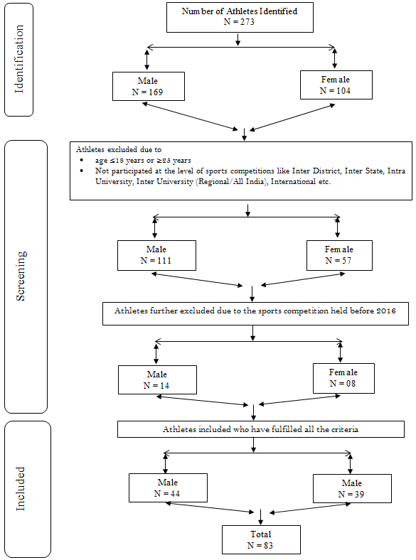 Participants: Total eighty three (83) University level athletes (Male – 44 and Female – 39) from different sports See Table 1, aged 18 to 25 years from Visva-Bharati University, Santiniketan, India who have at least represented their own district, state or University at the state, national or University (Regional/All India) level sports competition during the last 5 years duration See Table 2 and Figure 1. Purposive random sampling technique has been used for the selection of subjects.