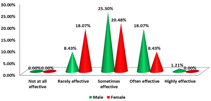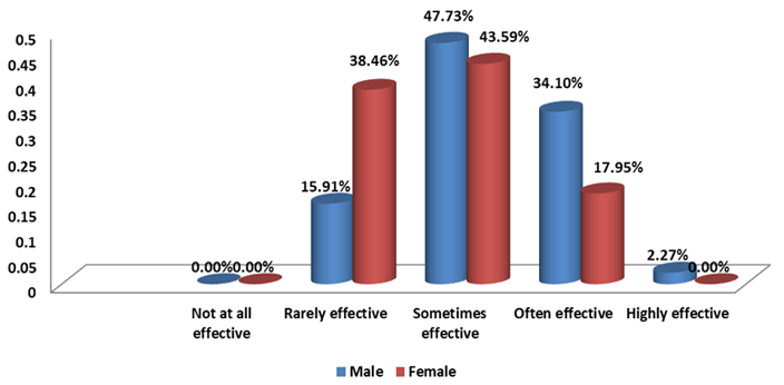 Multiple kinds of responses were recorded regarding the effectiveness of superstitious ritual behavior on sports performance enhancement. When we compare within the group negligible number of athletes of both the groups have responded as ‘not at all effective’ or ‘highly effective’; among the female athletes maximum number of athletes is of the opinion that superstitious ritual behavior is ‘rarely’ or ‘sometimes’ effective in sports performance enhancement, whereas maximum numbers of male athletes are of the opinion that ‘sometimes’ or ‘often’ superstitious ritual behavior is effective in sports performance enhancement See Table 3A and Figure 2. In overall percentage maximum number of athletes of both the group are of the opinion that sometimes superstitious ritual behavior is effective in sports performance enhancement See Table 3B and Figure 3.