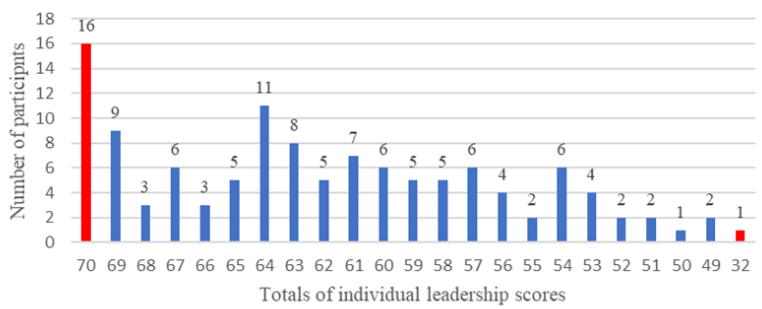 When analyzing the individual leadership scores, there was a large range of scores from a maximum of 70 points to a minimum of 32 points. The most frequent score (n=16) obtained by the survey athletes was the maximum score of 70, followed by the score of 64 obtained by 11 athletes. Figure 1 gives the spread of the individual scores of the Olympians in terms of their LTQ scores.