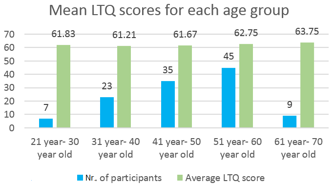 Gender differences between the mean LTQ scores were also analyzed. Female Olympians (n=64) scores higher, 62.53 compared to their male counterparts (n=55) who’s mean LTQ score was 61.14. By comparing the mean LTQ scores for each age group, we can conclude that a person's ability to develop leadership skills during their career and life is steadily increasing, as the results show in Figure 3.
