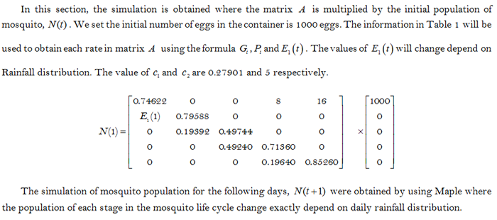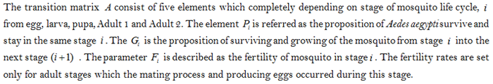 The projection matrix of Aedes aegypti life cycle was considered to forecast the population of mosquito based on distribution of rainfall. In this section, all the methods used to achieve the objectives of this research will be clearly explained. Generally, the population model is described in matrix algebra with consist of transaction rate of Aedes aegypti life cycle.
