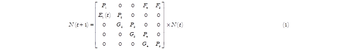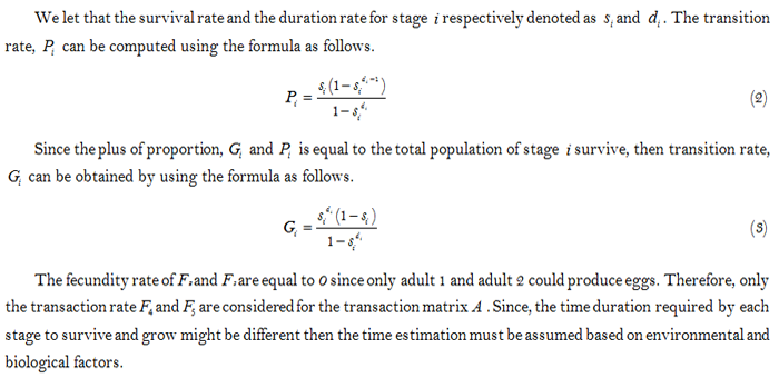 The population sizes with respect to age are difficult to determine precisely rather than considering the stages of population life cycle. Therefore, the stage-structured matrix model was constructed by considering the growth of mosquito life cycle stages and breeding maturity [10 ]. The population of Aedes aegypti mosquito is easier to identify based on their life cycle than its age because each life stage can be differently classified based on the growth of physical size. In this section, the simulation number of mosquito population at any time t will be assigned as N(t) and the transition matrix A is the transformation based on mosquito life cycle. The simulation of population at time t+1can calculate by multiply matrix A and N(t).