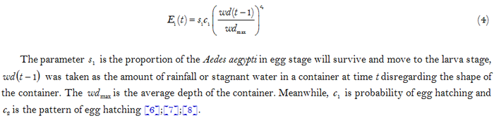 Water is the main source in the process of egg hatching. Therefore, we assumed that only uncovered and opening containers can be filled with amount of water caused by rainfall. The amount of water stagnated in the container will be a breeding site for the mosquito. In this situation, we considered that the heavy rainfall distribution possibly influences the egg hatching process by overflowing the water in containers. The Egg hatching process was directly associated with rainfall distribution can be described as a function of water depth with respect to time t (days).