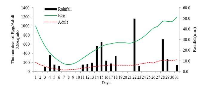 At the beginning of February (refer Figure 2), the number of eggs was high but the number goes down suddenly starting from week 8 to 25. We noticed that the frequency of receiving rainfall in this month is less than January. We could say that the rainfall distribution received in this month might affect the existence of mosquitoes breeding site where there might be none and lack of stagnant water in opening containers. However, this number increased drastically starting from the week 25 onwards. Hence, the adult mosquitoes also have the same trends as eggs.