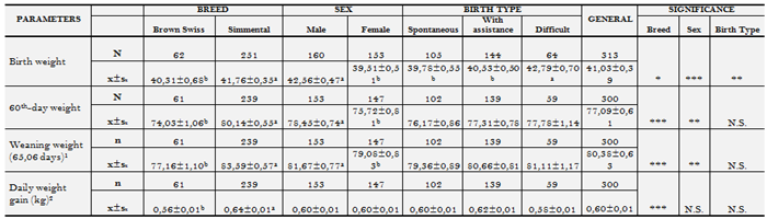 Table-1. Mean values and significance controls for the birth, 60th-day and weaning weights and daily weight gains of single born Brown Swiss and Simmental calves (kg)