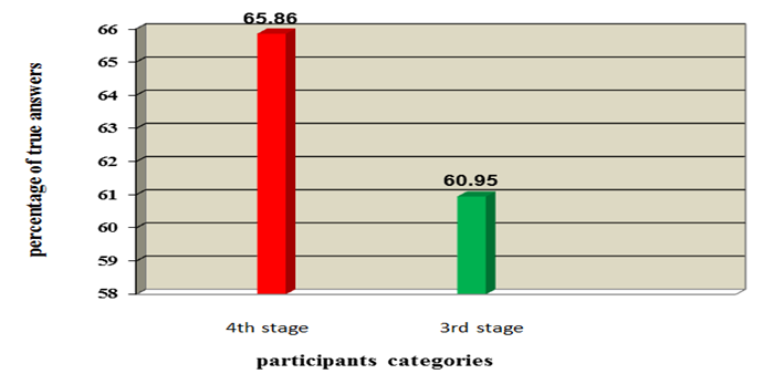 The results of the veterinary competence assessment 2017 as showed in Fig 1, reported that the results of the fourth stage were higher than the third (65.86 and 60.95) respectively. In a simple comparison of the results of this study with the results recorded in previous year, we note that the results recorded in 2016 for the fourth and third stage students according to Abu [10] in the test of performance appraisal of veterinarians, were higher than the results of the current year (71.03 and 62.46) respectively. On the other hand, the results of 2017 were higher than those recorded in 2015 by Abu [11] which were (62.26 and 56.80) respectively.