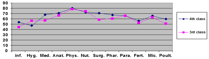 For the 3rd year students, the percentage of correct answers were: Internal Medicine 57.01, Histology 62.84, Poultry Diseases 51.47, Surgery 58.83, Fertility and Parturition 52.61, Pharmacology 61.03, Microbiology 62.84, Parasitology 66.13, Nutrition 75.11, Anatomy 66.81 and in Animal Hygiene 56.25. The 4th students were more superior students from the third year which might be due to the progression of the knowledge in the veterinary disciplines gained via their study and experiences. In addition 4th student gained a good experiences through the summer training when practiced at the veterinary hospital.