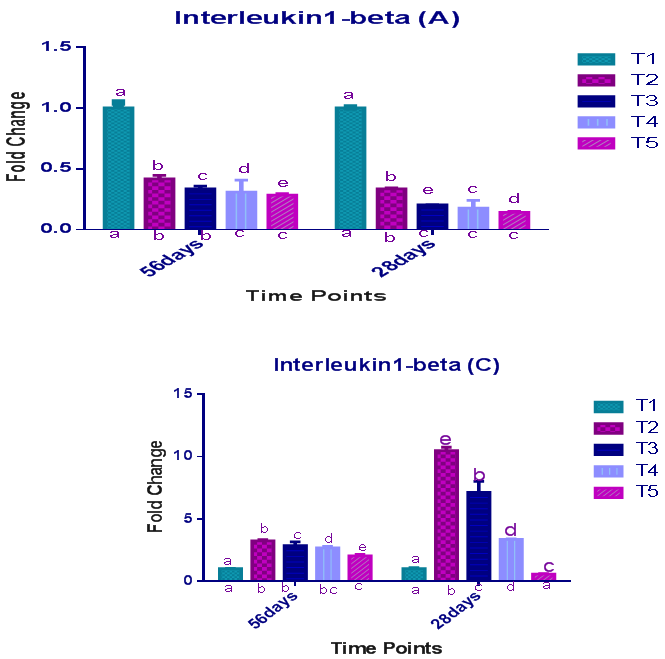 Figure-1 & Figure-2. Relative expression pattern of interleukin 1-beta (IL 1B) in the spleen of Arbor-acre (A) and Cobb500 (C) strains at 28 days and 56 days. abcde- bars with different superscript between time points were significantly different (P<0.05), while bars carrying different subscript within same time points were significantly different (P<0.05). 2-way ANOVA test was done with multiple comparisons corrected using Bonferroni’s method.