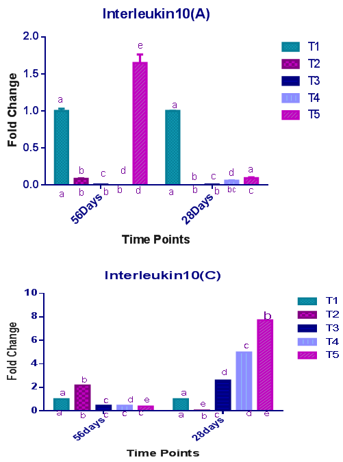 Figure-3 & Figure-4. Relative expression pattern of interleukin10 (IL 10) in the spleen of Arbor-acre (A) and Cobb500 (C) strains at 28 days and 56 days. abcde- bars with different superscript between time points were significantly different (P<0.05), while bars carrying different subscript within same time points were significantly different (P<0.05). 2-way ANOVA test was done with multiple comparisons corrected using Bonferroni’s method.