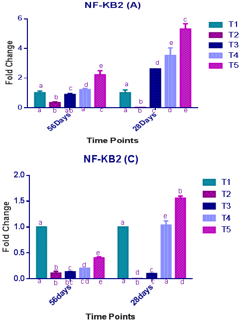Figure-7 & Figure-8. Relative expression pattern of Nuclear factor kappa B2 (NF-KB2) in the spleen of Arbor-acre (A) and Cobb500 (C) strains at 28 days and 56 days. abcde- bars with different superscript between time points were significantly different (P<0.05), while bars carrying different subscript within same time points were significantly different (P<0.05). 2-way ANOVA test was done with multiple comparisons corrected using Bonferroni’s method.